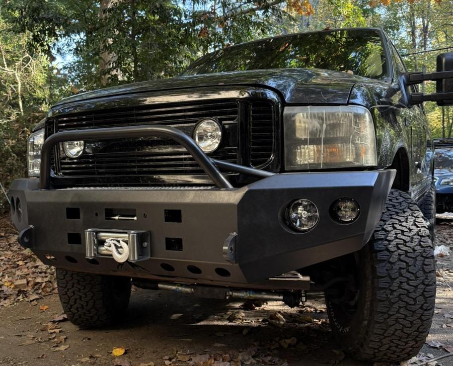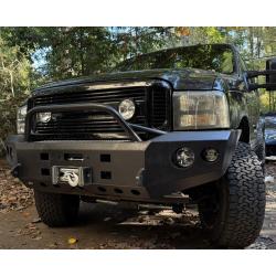 Full Steel replacement bumper for the 1999-2004 Ford Super Duty or Excursion. The bumper is mainly constructed from 3/16" steel with 1/4" in critical areas. The bumper will accommodate up to a 15,000 lbs. large frame winch. The bumper wings will accommodate a set of PIAA 550 lights and a set of Rigid A360 4" lights (see below for other options). The bumper comes with a standard finish of Metalsmith Satin Black Enamel, other options available. Winch and lights are not included. Please see our accessories store for winches and lights.